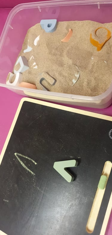 Enterramos letras en materiales como arena, arroz o harina, y ellos las buscan con sus manos, estimulando el tacto y la curiosidad. Al descubrirlas, las identifican y las copian en la pizarra, reforzando el reconocimiento visual y la motricidad fina. Es una actividad que combina juego, exploración y aprendizaje de forma natural.